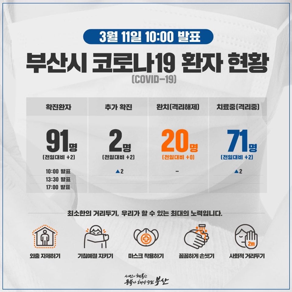 부산시는 11일 코로나19 확진자가 2명 추가 발생했다고 밝혔다. 확진자 중 해운대구에 거주하는 96년생 남성은 최근 이탈리아에서 입국한 것으로 확인됐다. 또 다른 확진자는 동래구에 거주하는 64년생 여성으로 경남확진자와 접촉했다. 부산시는 현재까지 확인된 확진자에 대해 이동경로 및 접촉자 확인 등 역학조사를 실시하고 있다. 이로써 부산시의 코로나19 확진자는 91명이다. 독자들의 PICK! 홍서범·조갑경 아들, 아내 임신 중 '여교사와 불륜'…"위자료 배상" 8살 차이 장모·사위, 금단의 관계로...회복 불가 외도 사례 아내 산후조리원에 있는데...'친구 여친'과 불륜 남편, 성폭행 고소전까지 40억 건물주 된 이해인..."월 이자 600만원, 모르고 계약" 멘붕