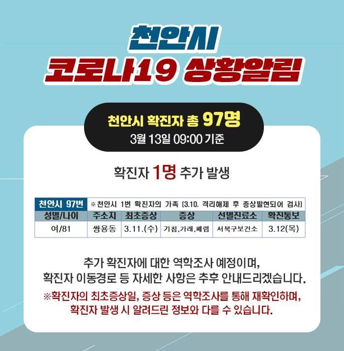 천안 줌바 수강생 가족이 코로나19 확진 판정을 받았다. 천안시는 13일 오전 9시 기준 코로나19 확진자가 1명 추가 됐다고 밝혔다. 확진자 A씨는 81세 여성으로 줌바 수강생인 1번 확진자의 어머니다. 지난 10일 자가격리에서 해제된 후 다음날인 11일 증상을 보여 검사를 실시한 결과 확진 판정을 받았다. 시는 역학조사가 완료되는 대로 동선을 공개할 예정이다. 이로써 천안시 코로나19 확진자 수는 총 97명이다. 독자들의 PICK! "자습 때 둘이 사라져"...홍서범 아들 불륜, 학생들 잇단 제보 월 700만원 벌어도..."생활비 30만원, 한국인 남편 짠돌이" 8살 차이 장모·사위, 금단의 관계로...회복 불가 외도 사례 "며느리 불륜" 공방에...신혼집에 몰카 설치한 류중일 전 사돈