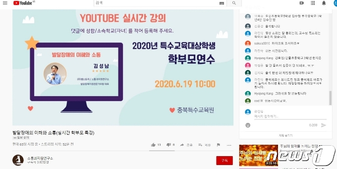 (청주=뉴스1) 이성기 기자 = 충청북도특수교육원(원장 신사호)은 19일 특수학교(급) 유·초·중·고등학교 특수교육 학생 학부모 120여명을 대상으로 발달장애를 이해하는 실시간 화상연수를 진행했다.
