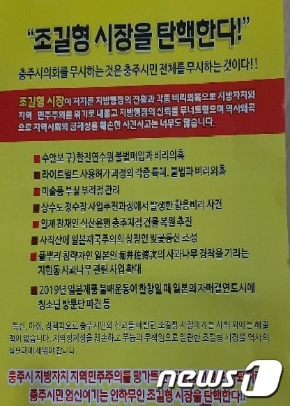 (충주=뉴스1) 윤원진 기자 = 조길형 충북 충주시장의 퇴진을 주장하는 단체가 조 시장을 비방하는 내용이 담긴 전단을 제작·배포해 논란이다.
