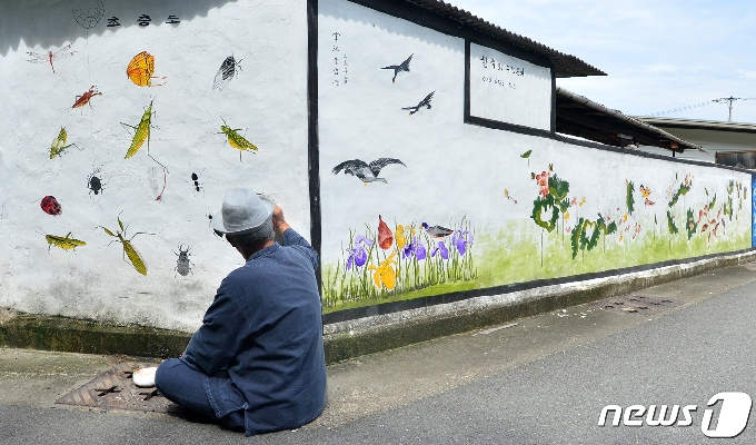초충도(草蟲圖) 명인 이철우 화백이 31일 오후 경북 포항시 북구 용흥동 주택가 벽에 풀벌레를 소재로 한 초충도 벽화를 그리고 있다. 이 화백은 초충도 매력에 빠져 공무원 생활을 접고 화풍 연구에 전념하고 있으며 재능기부로 벽화를 그려주고 있다. 2020.7.31/뉴스1 © News1 최창호 기자
