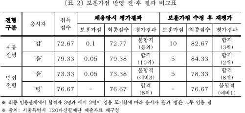 보훈가점대상자별 적용비율은 만점의 5%, 10%로 차등화돼 있는데 그는 이 가운데서도 높은 쪽인 10%를 받을 자격이 있었다. 하지만 120다산콜센터는 서류전형(100점 만점)에서 그에게 10점도, 5점도 아닌 '0.1점'을 가점으로 줬다. 그가 서류전형에서 받은 점수는 72.77점이었지만 서울시 감사위원회가 재채점해본 결과 82.67로 서류전형 합격권(3위)이었다.