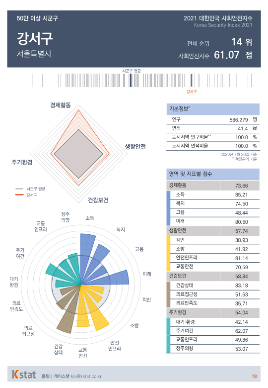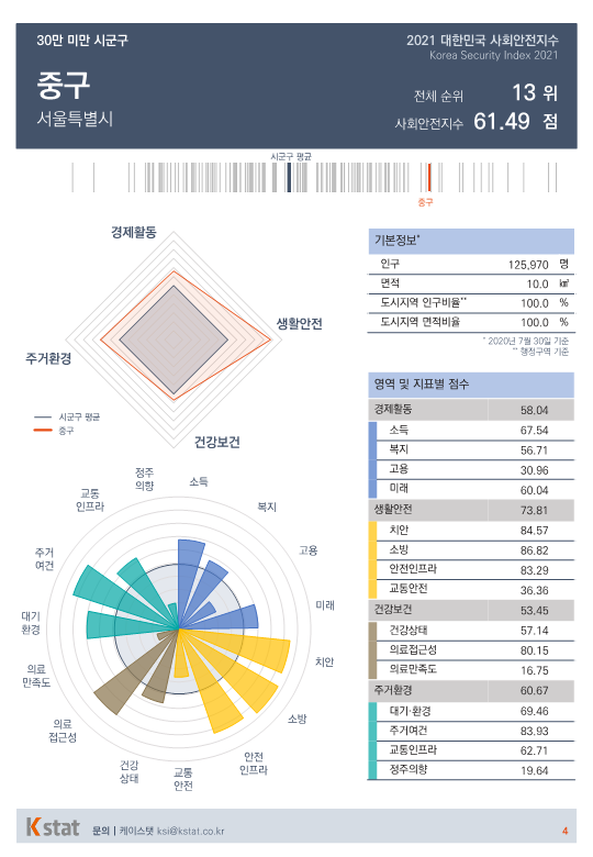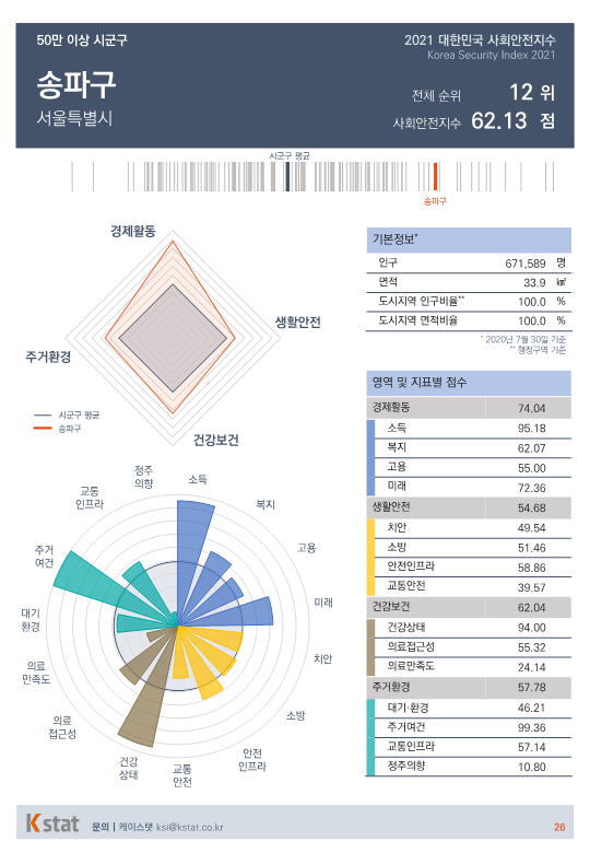 전국 시·군·구 중 표본 숫자가 적은 지역을 제외한 155곳을 대상으로 경제활동, 생활안전, 건강보건, 주거환경을 종합한 사회안전지수 순위를 매겼다.