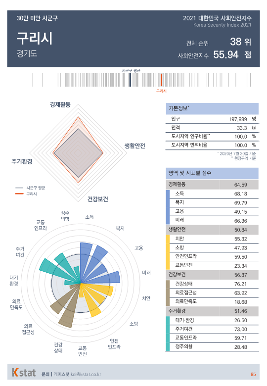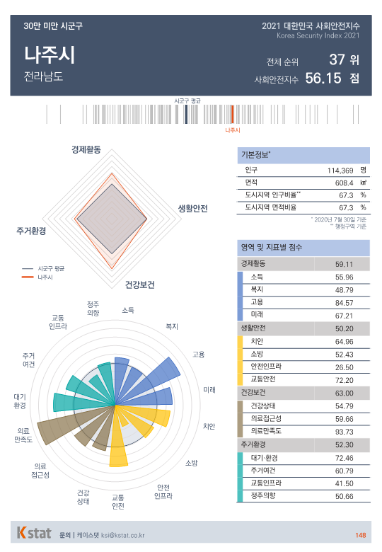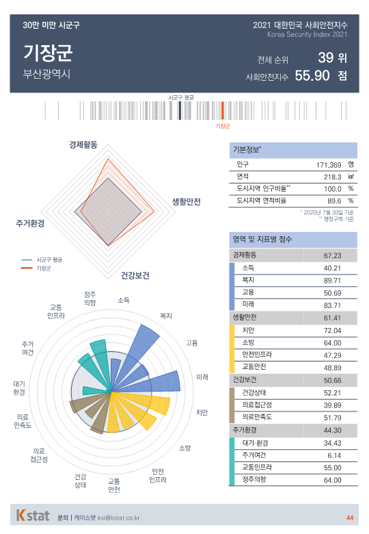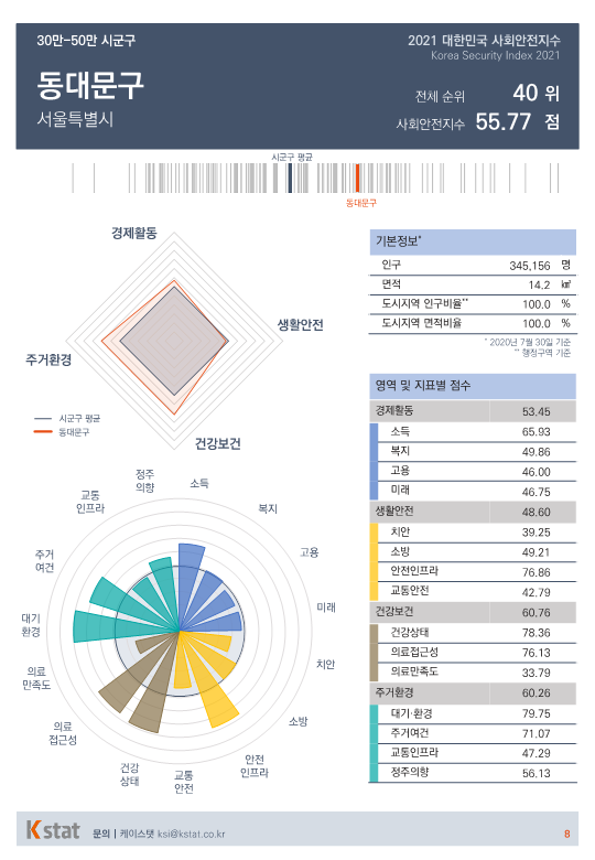전국 시·군·구 중 표본 숫자가 적은 지역을 제외한 155곳을 대상으로 경제활동, 생활안전, 건강보건, 주거환경을 종합한 사회안전지수 순위를 매겼다.