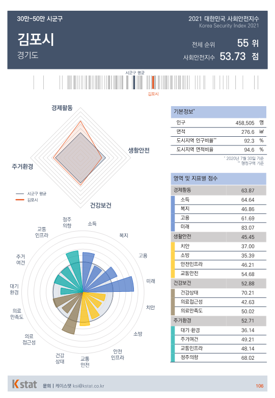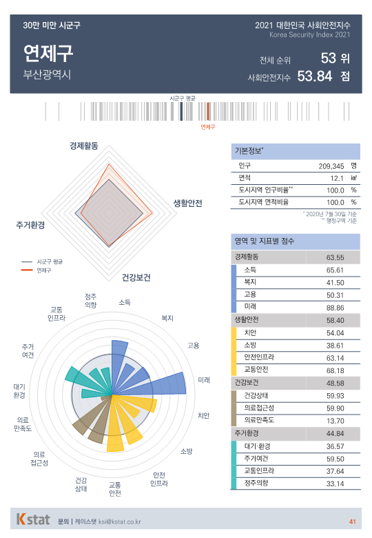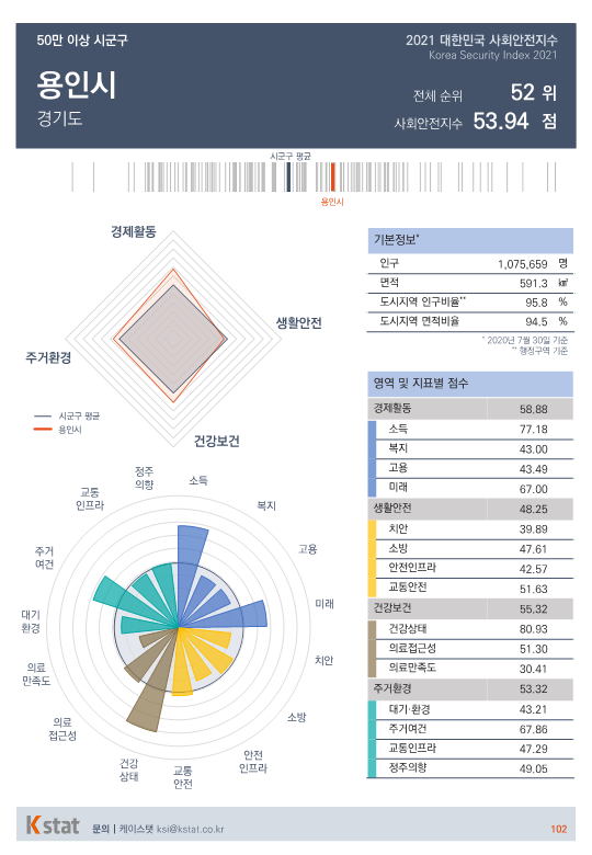 전국 시·군·구 중 표본 숫자가 적은 지역을 제외한 155곳을 대상으로 경제활동, 생활안전, 건강보건, 주거환경을 종합한 사회안전지수 순위를 매겼다.
