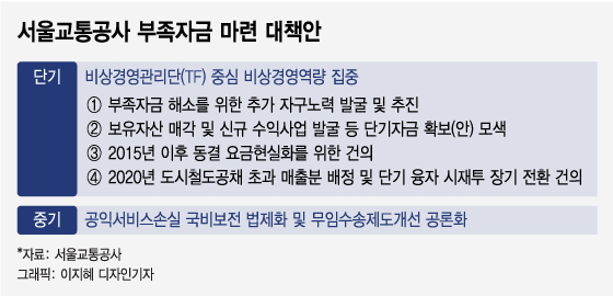 공사는 우선 직원 피복비, 커피값 등 복리후생비를 줄이는 등 자구노력을 진행한다. 사당주차장 부지(3400억원), 용산국제빌딩(504억원) 등도 적극 추진한다. △도시철도공채 초과 매출분 배정 △도시철도공채 (부채) 이관 △무임승차제도 개선 공론화 등도 목표로 삼았다.