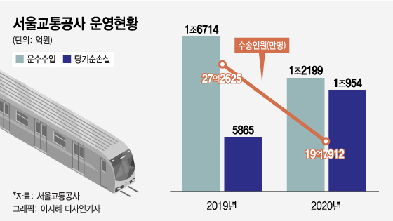 서울 지하철 1∼8호선과 9호선 2·3단계 구간의 수송 인원은 2019년 27억2625만명에서 지난해는 19억7912만명으로 27.4%나 급감했다. 하루 평균 이용객은 2019년 746만9180명이었으나, 지난해는 541만9368명까지 줄었다. 공사의 운수 수입도 2019년 1조6714억원에서 지난해 1조2199억원으로 4515억원 감소했다.