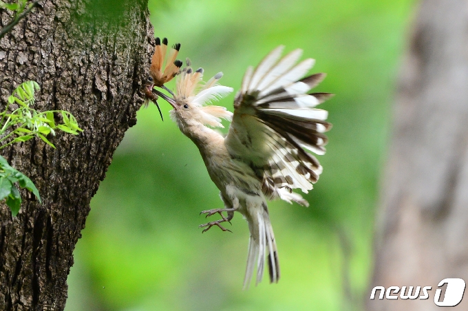 (경주=뉴스1) 최창호 기자 = 깃털이 흰색인 후투티가 12일 경북 경주시 옥산서원 인근 나무에서 새끼들에게 먹잇감을 물어다 주는 모습이 국내 언론 최초로 포착됐다. 여름새인 후투티는 몸통이 갈색 빛이지만 이번에 발견된 후투티는 목과 몸통, 꼬리깃이 흰색이다. 알비노개체에 대한 연구는 현재 전무하다 할 정도이지만 최근 알비노개체의 잦은 출현을 보고 학자들은 환경의 변화가 가장 큰 요인으로 보고 있다. 2021.5.12/뉴스1