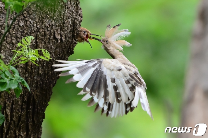 (경주=뉴스1) 최창호 기자 = 깃털이 흰색인 후투티가 12일 경북 경주시 옥산서원 인근 나무에서 새끼들에게 먹잇감을 물어다 주는 모습이 국내 언론 최초로 포착됐다. 여름새인 후투티는 몸통이 갈색 빛이지만 이번에 발견된 후투티는 목과 몸통, 꼬리깃이 흰색이다. 알비노개체에 대한 연구는 현재 전무하다 할 정도이지만 최근 알비노개체의 잦은 출현을 보고 학자들은 환경의 변화가 가장 큰 요인으로 보고 있다. 2021.5.12/뉴스1