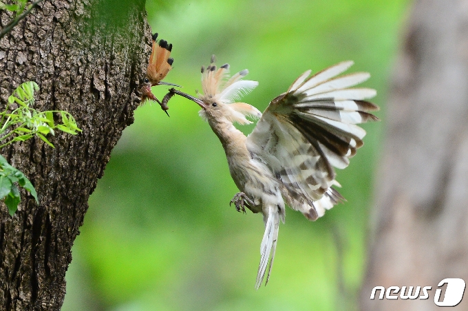 (경주=뉴스1) 최창호 기자 = 깃털이 흰색인 후투티가 12일 경북 경주시 옥산서원 인근 나무에서 새끼들에게 먹잇감을 물어다 주는 모습이 국내 언론 최초로 포착됐다. 여름새인 후투티는 몸통이 갈색 빛이지만 이번에 발견된 후투티는 목과 몸통, 꼬리깃이 흰색이다. 알비노개체에 대한 연구는 현재 전무하다 할 정도이지만 최근 알비노개체의 잦은 출현을 보고 학자들은 환경의 변화가 가장 큰 요인으로 보고 있다. 2021.5.12/뉴스1
