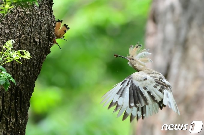 (경주=뉴스1) 최창호 기자 = 깃털이 흰색인 후투티가 12일 경북 경주시 옥산서원 인근 나무에서 새끼들에게 먹잇감을 물어다 주는 모습이 국내 언론 최초로 포착됐다. 여름새인 후투티는 몸통이 갈색 빛이지만 이번에 발견된 후투티는 목과 몸통, 꼬리깃이 흰색이다. 알비노개체에 대한 연구는 현재 전무하다 할 정도이지만 최근 알비노개체의 잦은 출현을 보고 학자들은 환경의 변화가 가장 큰 요인으로 보고 있다. 2021.5.12/뉴스1