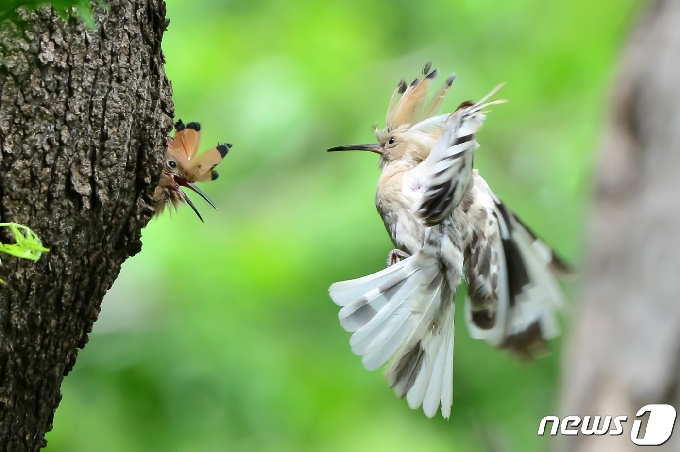 (경주=뉴스1) 최창호 기자 = 깃털이 흰색인 후투티가 12일 경북 경주시 옥산서원 인근 나무에서 새끼들에게 먹잇감을 물어다 주는 모습이 국내 언론 최초로 포착됐다. 여름새인 후투티는 몸통이 갈색 빛이지만 이번에 발견된 후투티는 목과 몸통, 꼬리깃이 흰색이다. 알비노개체에 대한 연구는 현재 전무하다 할 정도이지만 최근 알비노개체의 잦은 출현을 보고 학자들은 환경의 변화가 가장 큰 요인으로 보고 있다. 2021.5.12/뉴스1