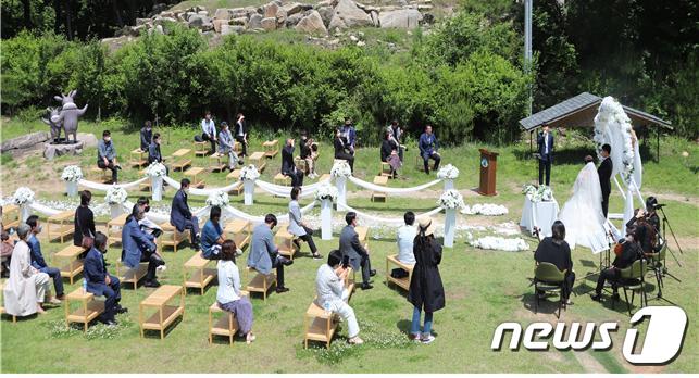 신랑·신부의 가족과 지인도 숲속 결혼식장을 방문해 방역 수칙을 준수하며 신혼부부의 앞날을 축복했다.