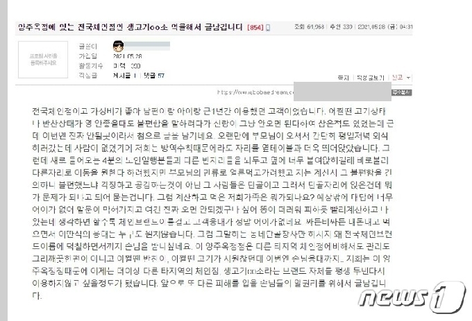 31일 이 커뮤니티 누리꾼 등에 따르면, 지난 28일 '양주옥정에 있는 전국체인점 생고기00소 억울해서 글남깁니다'라는 제목의 글이 게시된 것으로 알려졌다.