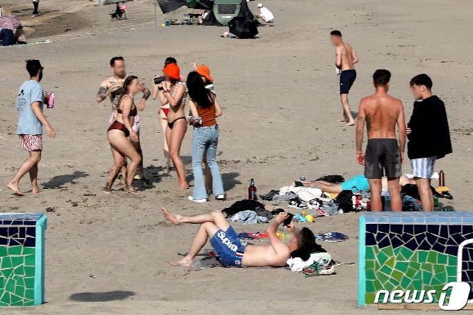 해변에 돗자리를 깔고 자리를 잡은 10여 명의 외국인들은 5인 이상 집합금지에도 불구하고 함께 모여 있었다.