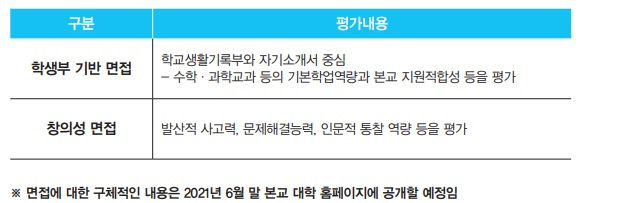 다만 우리 학교 면접이 독특한 방식으로 이뤄질 것은 확실하다. 면접은 학생부 면접과 창의성 면접으로 나뉘는데 학교와 국민, 수험생 모두가 인정할 수 있는 (창의적 인재를 뽑는) 방법이 뭘지 교수들이 연구하고 있다. 학생부 기반 면접은 학업 역량을 검증하는 방향으로 갈 것이다.