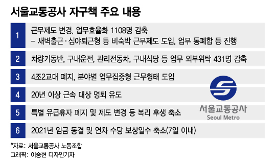 이에 공사는 전체 인력의 약 10%에 해당하는 1500여 명의 인력 감축을 추진한다는 계획을 노조에 제시했다. 차량기동반과 기지 기계 관리, 구내식당 등 비핵심 업무를 자회사나 외부 전문기관에 위탁하는 방식으로 400여 명도 줄인다. △심야 운행 폐지 △올해 임금 동결 및 복지비 축소 △사당 복합환승센터 등 보유자산 매각 등도 담겼다.