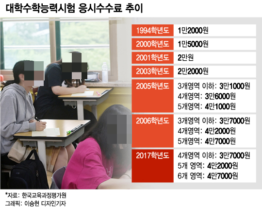 수능이 처음 치러진 1994학년도에 응시수수료는 1만2000원이었다. 이후 거침없는 인상이 이뤄졌다. 2000학년도(1만5000원), 2001학년도(2만원), 2003학년도(2만2000원)까지 거의 매년 응시수수료가 올랐다. 2005학년도에는 영역별 차등을 뒀고, 3만1000원~4만1000원으로 인상됐다.