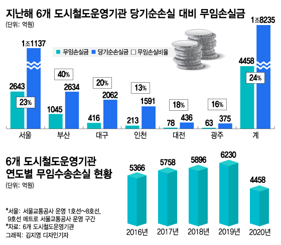 노사 갈등의 원인은 '적자' 지하철이다. 코로나19(COVID-19) 사태에 따른 사회적 거리두기로 승객이 줄었다. 지하철 요금은 수년째 동결 중이다. 무임승차 비용은 눈덩이처럼 커지고 있다. 악재만 쌓이다 터지기 일보 직전이다. 지난해 6개 지자체 지하철 운영기관은 모두 적자를 기록했다. 서울교통공사가 1조1137억원으로 가장 많았다. 올해도 1조6000억원 안팎의 손실이 예상된다.