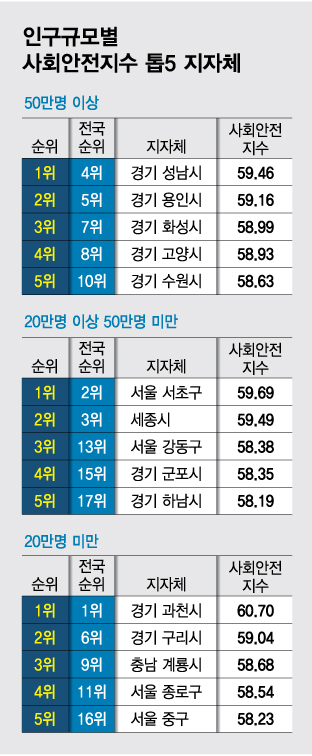 사회안전지수 '톱10'에 경기도 도시들이 대거 몰린 점도 두드러진다. 1위를 차지한 과천시 뿐 아니라 성남시(4위·59.46점), 용인시(5위·59.16점), 구리시(6위·59.04점), 화성시(7위·58.99점), 고양시(8위·58.93점), 수원시(10위·58.63점)가 상위권에 포진했다.