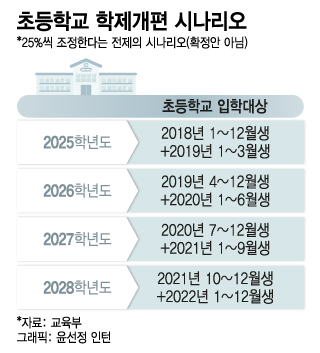정부가 단계적인 제도 도입을 검토한 것은 혼선을 줄이기 위해서다. 일률적으로 제도를 도입할 경우 특정해에 A연도생과 A+1연도생이 같은 해에 입학한다. 대입 경쟁률 등에서도 혼란이 발생할 수 있다. 출생아가 급격히 줄어들고 있는 상황에서 25%씩 입학생을 늘려도 교사와 교실 등 인프라에 큰 부담이 작용하지 않는다는 판단 역시 들어간 것으로 풀이된다.