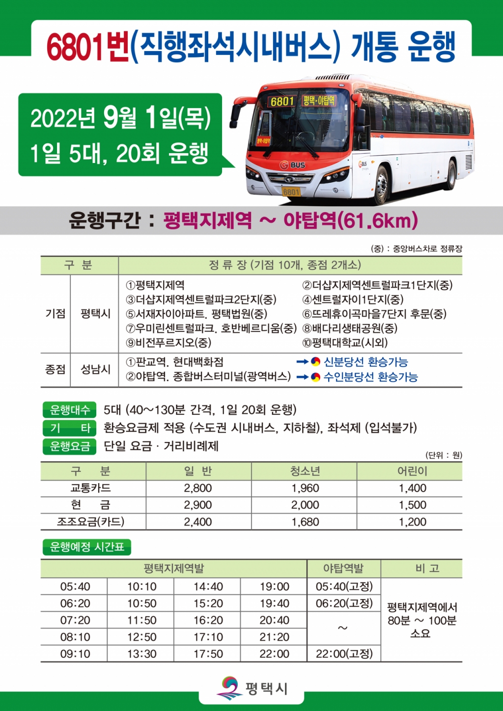 경기 평택시는 관내 지제역과 성남시 판교 야탑역을 연결하는 광역버스(노선번호 6801번)가 내달 1일 첫 운행에 나선다고 29일 밝혔다.