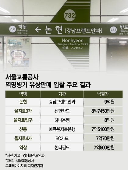 서울교통공사, 유상 역명병기 사업-7호선 논현역 사용 금액 최고가