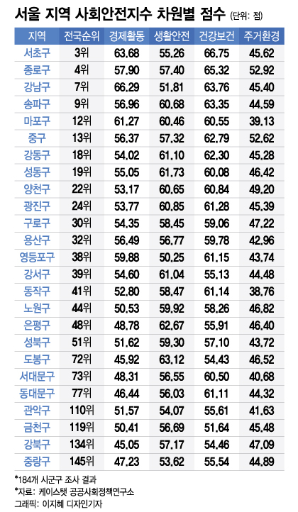 서울에서 사회안전지수가 가장 높은 자치구는 서초구(60.32점)였다. 정량지표(9위)와 정성지표(2위) 모두 최상위권을 기록하며 전체 3위를 차지했다. 특히 의료환경·주민 건강상태 등을 측정하는 건강보건 분야(66.75점)에서 전국 1위를 기록했다. 상급종합병원인 강남성모병원이 위치해 있고, 특화병원·개인병원 등이 많아 의료기관 접근성이 높기 때문으로 풀이된다.