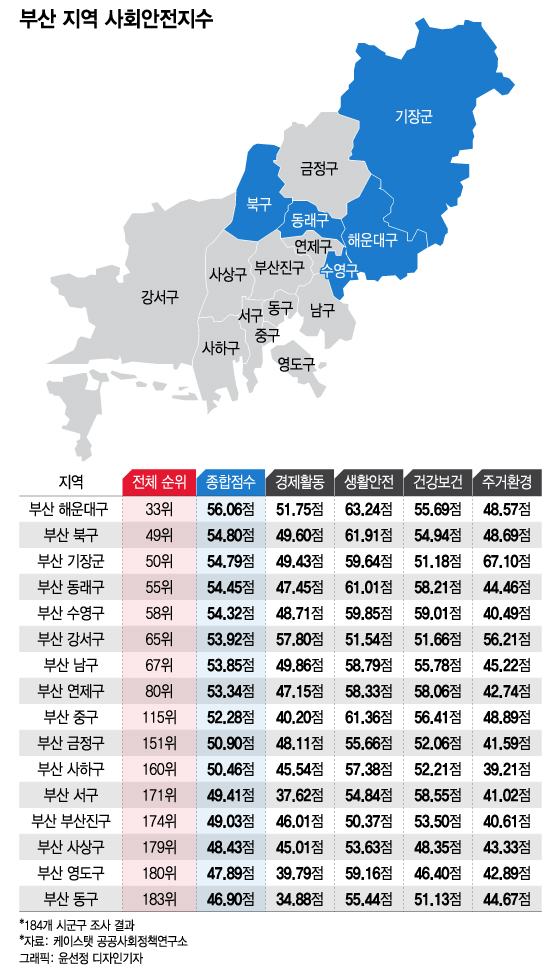 부산의 대표 '부촌'으로 꼽히는 해운대구가 지역에서 가장 살기 좋은 도시로 꼽혔다. 교통안전과 소방 등의 영역에서 차별화된 평가를 받으며 생활안전 분야에서 전국 최상위권을 기록했다. 울산에선 가장 안전한 도시로 평가된 북구가 살기 좋은 지역 1위에 올랐다.