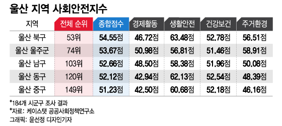울산에선 현대차(499,000원 ▼7,000 -1.38%) 공장이 있는 북구가 전국 53위(54.55점)로 1위 자리를 지켰다. 전국 8위(63.48점)를 기록한 생활안전 분야가 순위 상승을 이끌었다. 치안과 소방, 교통안전 등 3가지 대표 영역에서 전국 평균 이상의 점수를 받았고, 자동차 관련 산업단지와 농공단지가 밀집해있어 경제활동 분야 내 소득 영역(70.91점)에서 전국 최상위권을 차지했다.