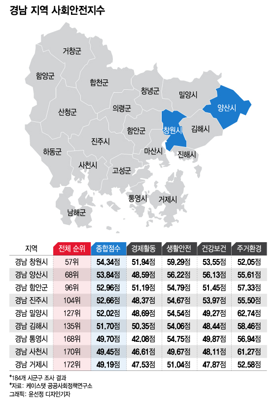 경남에서 1위를 차지한 창원시는 전국 57위(54.34점)에 기록했다. 소방·치안 등의 영역을 조사한 생활안전 분야에서 상위권인 전국 42위(59.29점)에 올랐고, 교통사고 발생건수가 낮으면서 화재 대응 수준이 높은 것으로 나타났다. KTX(마산·창원·창원중앙역)와 경전선(마산·창원·창원중앙·중리역) 등이 지나면서 대중교통이 발달해 있고, 소방 인프라 등이 잘 갖춰진 것이 긍정적으로 작용했다.