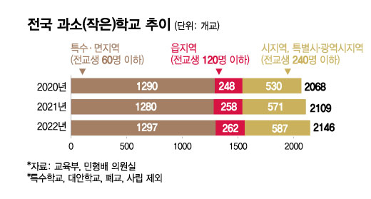 이처럼 학교 운영의 마지노선이라고 할 수 있는 '작은 학교'는 전국에서도 매년 늘고 있다. 특수학교와 사립을 제외한 전국 공립 초등학교 중 과소학교는 2020년 2068교에서 지난해 2146교로 약 3.8%(78교) 늘었다. 이 중 특수·면지역은 전교생 60명을 넘지 못한 초등학교가 지난 2020년 1290개교에서 지난해 1297개교까지 늘었다. 같은 기간 읍지역도 248교에서 262개교로 증가했다.