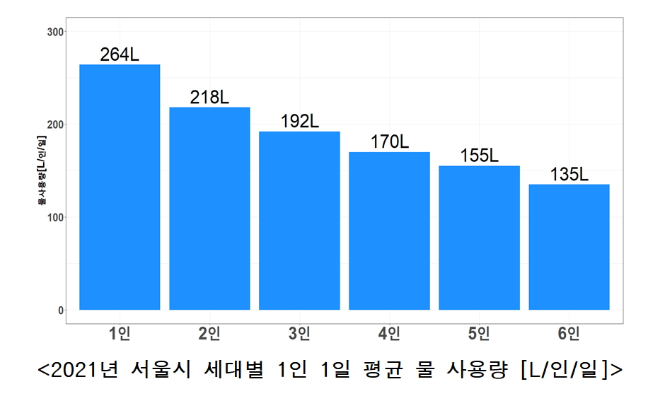 연구 결과에 따르면 1인당 하루 물 사용량은 가구원 수가 많아질수록 감소했다. 가구원 수에 따른 전체 물 사용량을 보면 △1인 가구는 하루 평균 264L △2인 가구 435L △3인 가구 576L △4인 가구 679L △5인 가구 777L △6인 가구 813L를 사용했다.