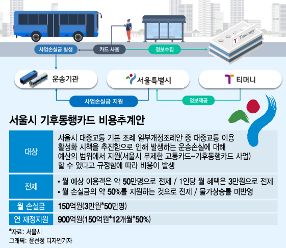 시는 기후동행카드 도입으로 인한 운송 손실에 대해 50%를 보전한다는 방침이다. 기후동행카드의 월 예상 이용객은 약 50만명으로 잡고 승객 1명당 혜택을 3만원(대중교통 60회 및 따릉이 이용)으로 판단해 이로 인한 손실 규모는 월 150억원에 달할 것으로 시는 추정했다. 손실금을 1년으로 환산해 50%의 재정지원을 감안하면 연간 재정지원 규모는 900억원 정도다.