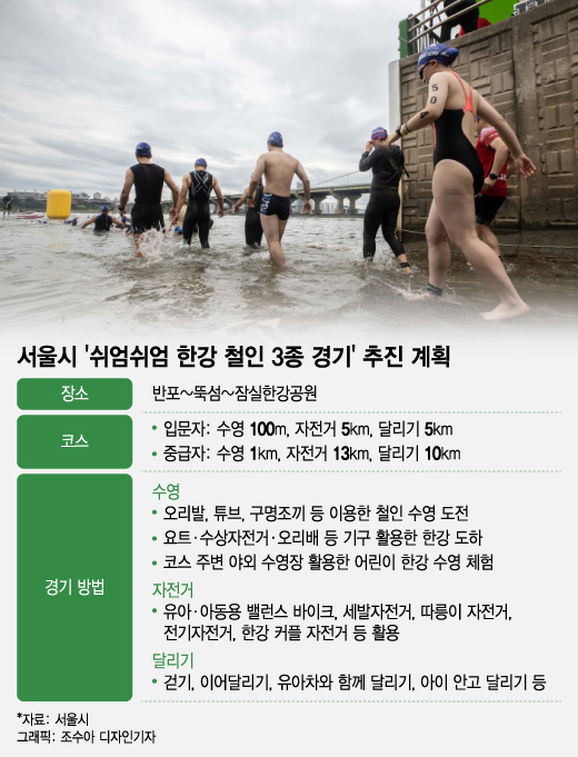 서울시가 올해 처음으로 가족들이 함께 참여할 수 있는 '철인 3종 경기'를 선보인다. 수영·사이클·마라톤 종목을 기반으로 시민들이 한강에서 체육활동을 즐기는데 초점을 맞춘다.