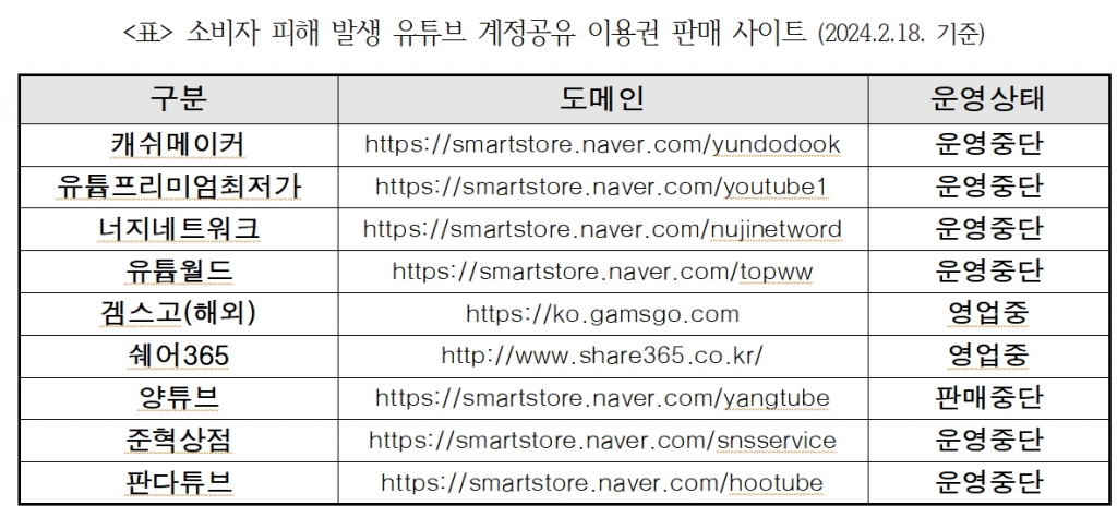 피해가 접수된 유튜브 계정공유 이용권 판매사이트는 '캐쉬메이커'를 비롯해 '유튭프리미엄최저가', '판다튜브', '준혁상점(SNS SERVICE)', '유튭월드', '너지네트워크' 등의 국내 사이트와 해외 사이트 '겜스고' 등도 포함됐다.