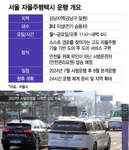 시는 2022년부터 상암 지역 자율주행버스 도입을 시작으로 관련 분야에 공격적으로 투자하고 있다. 일찌감치 5년간(2022~2026년) 1487억원 투입을 공언했고, 청계천·청와대·여의도 일대에서 자율주행버스를 선보인 바 있다. 오는 8월부터는 미국과 중국에 이어 세계 3번째로 심야 자율주행택시 도입을 추진한다. 일단 3대 이상의 자율주행택시를 강남에서 운행한다는 계획이다. 자율주행택시는 버스와 달리 정해진 노선이 아닌 탑승객에 따라 달라지는 '도어 투 도어(Door to Door)' 방식으로 운행해 고도의 기술력이 요구된다.