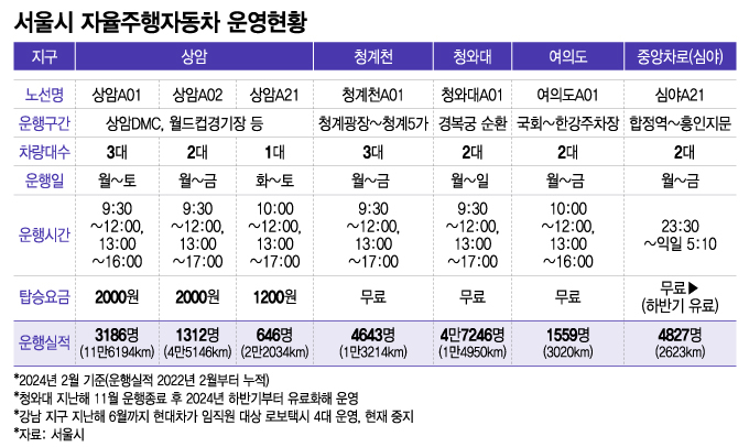 한편 시는 2022년 2월부터 상암 지역에 자율주행버스를 도입한 뒤 청계천, 청와대, 여의도 일대에서도 운영을 해왔다. 지난 2월까지 누적 승객은 약 6만여명 정도다. 지난해 12월부터는 합정역~흥인지문 구간에서 심야 자율주행버스를 운행 중이다.