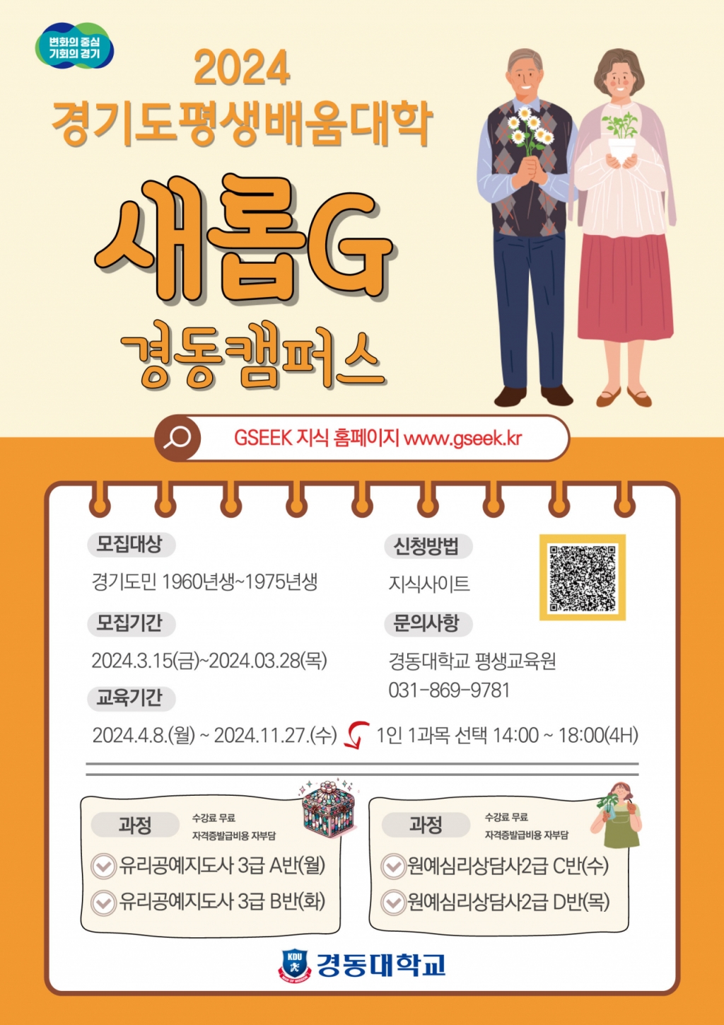 장미소 경동대 평생교육대학 주임은 "제2의 삶을 준비하는 5060세대에게 꼭 필요한 맞춤형 강좌"라며 "수강생의 활력 증진은 물론 자격증 취득과 일자리 창출에 실질적인 도움이 되는 커리큘럼을 구성했다"고 설명했다.