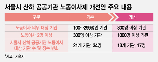 지방자치단체 최초로 노동이사제를 도입한 서울시가 산하 공공기관 노동이사제 운영 기준을 강화한다. 그간 정원 100명 이상인 기관에 대해 노동이사를 의무적으로 두도록 한 것을 300명 이상으로 대폭 높인다. 노동이사 규모가 크게 줄어드는 셈이다.