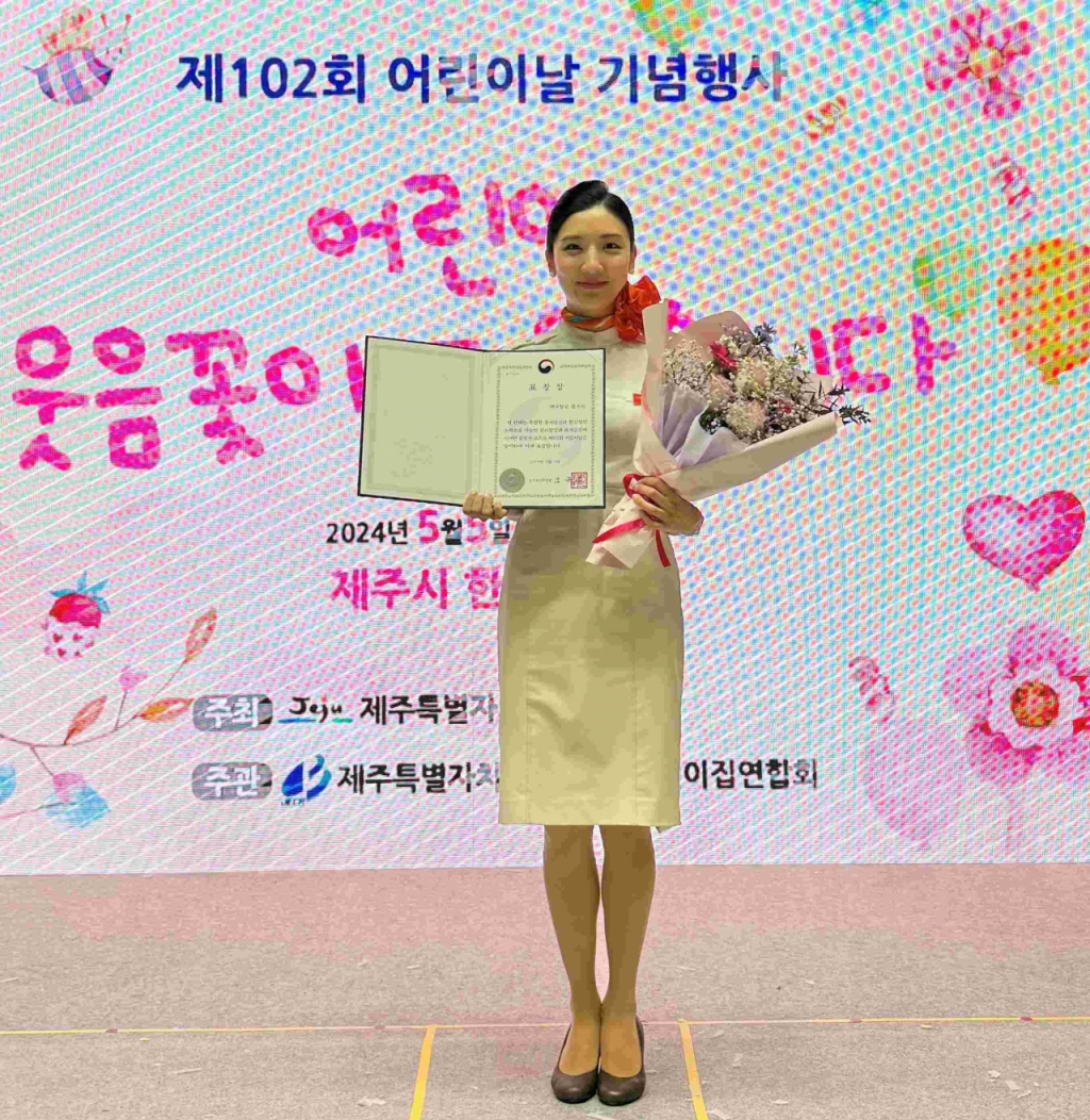 제주항공 객실승무원 재능기부 봉사단이 지난 5일 제주 한라체육관에서 개최된 '2024년 제102회 어린이날 기념 행사'에서 보건복지부장관 표창을 수상했다고 7일 밝혔다.