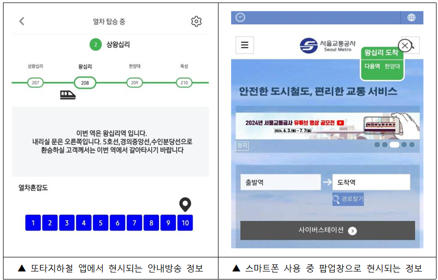 공사가 지난해 9월 지하철 이용 시민 839명을 대상으로 실시한 설문에 따르면, 응답자의 72%가 지하철 안내방송을 인식하지 못해 하차 역을 놓친 경험이 있는 것으로 나타났다. 모바일로 도착역 안내 서비스가 제공되면 사용할 의향이 있는지에 대해선 82%가 그렇다고 답했다.