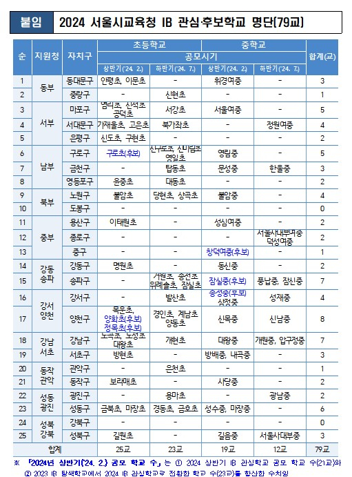 이에 따라 '지속 가능한 수업‧평가 혁신'을 선도할 서울 IB 관심학교는 73곳으로 확대됐다. 현재 운영 중인 IB 후보학교(초 3교+중 3교)를 포함하면 IB 관심 및 후보학교는 총 79곳으로 늘어난다.