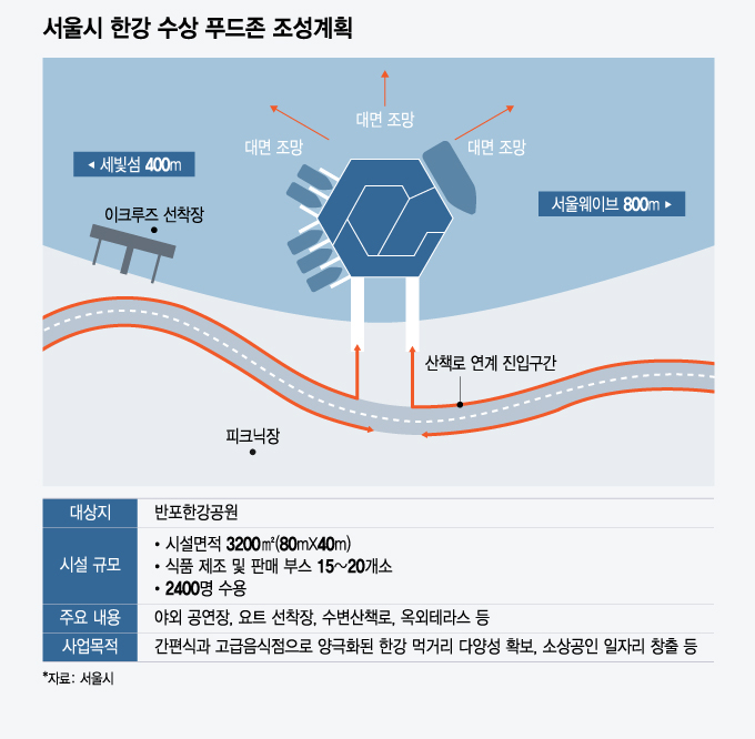 오는 2027년 서울 한강에 약 970평 규모로 조성되는 '수상 푸드존'의 최종 사업 대상지로 반포한강공원이 선정됐다.