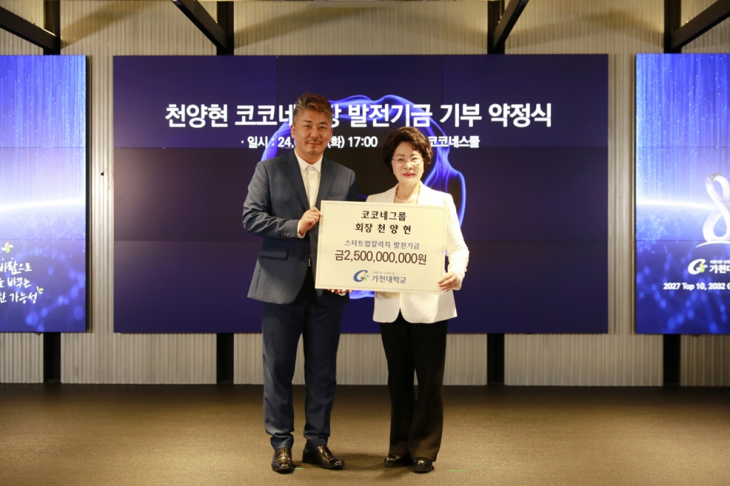천 회장은 오는 2028년까지 매년 5억원씩 기부한다. 앞서 기탁한 가천대 스타트업칼리지 조성비 33억원과 코코네스쿨 운영비 1억3000만원 등 천 회장이 가천대에 기부한 금액은 60억3000만원에 달한다.