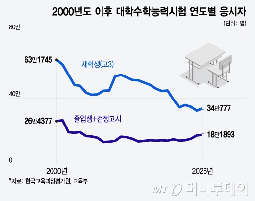 1994년 수능 도입 이후 고등학교 재학생 출신 응시생은 2000학년도에 63만1745명으로 최고치를 찍고 2025학년도 34만777명으로 반토막이 났다. 같은 기간 졸업생 출신 응시생도 25만64명에서 올해 16만1784명으로 35%가량 줄었다. 학령 인구 감소 탓이다. 반면, 검정고시생 등은 이 기간 1만4313명에서 2만109명으로 되레 늘었다. 검정고시 등 수험생이 2만명을 넘은 건 수능 2년 차인 1995학년도(4만2297명) 이후 30년 만에 처음이다.