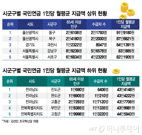지역별 국민연금 수급액과 수급비율 불균형이 심한 것으로 나타났다. 경북 구미시에서는 65세 이상 인구의 92% 가까이가 국민연금을 받았지만 충남 계룡시에서는 절반 정도만 수급자였다. 울산 동구는 1인당 월평균 지급액이 92만원에 육박한데 반해 전남 진도군은 이 금액의 절반에도 미치지 못했다.