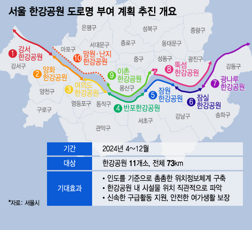 시 관계자는 22일 "서울의 대표 여가 공간으로 자리 잡은 한강공원에 도로명 주소를 부여해 안전한 여가 생활 제공과 안전 문제가 발행할 경우 신속한 구조 활동을 지원할 것"이라고 밝혔다. 앞서 시는 지난 4월부터 '한강공원 도로명 부여 계획'을 세우고 기초조사 및 데이터 구축, 전문가 자문 등을 진행해 온 것으로 알려졌다.