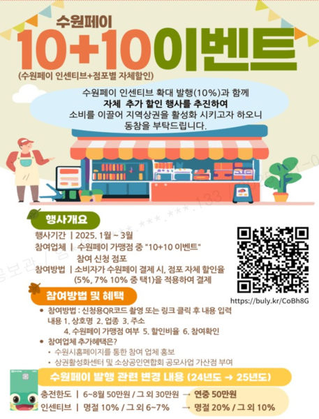 이번 이벤트는 소상공인과 협력해 침체한 민생경제에 활력을 불어넣기 위해 마련했다. 수원페이 가맹점 중 10+10 이벤트에 참여하는 업체에서 수원페이로 결제하면 최대 10%를 할인해 준다. 참여 업체는 할인율(5%, 7%, 10%)을 선택할 수 있다.