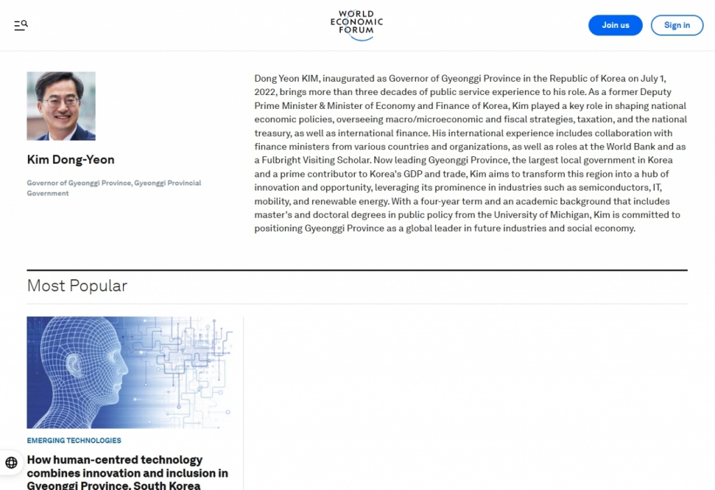 다보스포럼은 특별세션을 통해 김 지사에 대한 소개 페이지를 만들어 제공하고 있다.